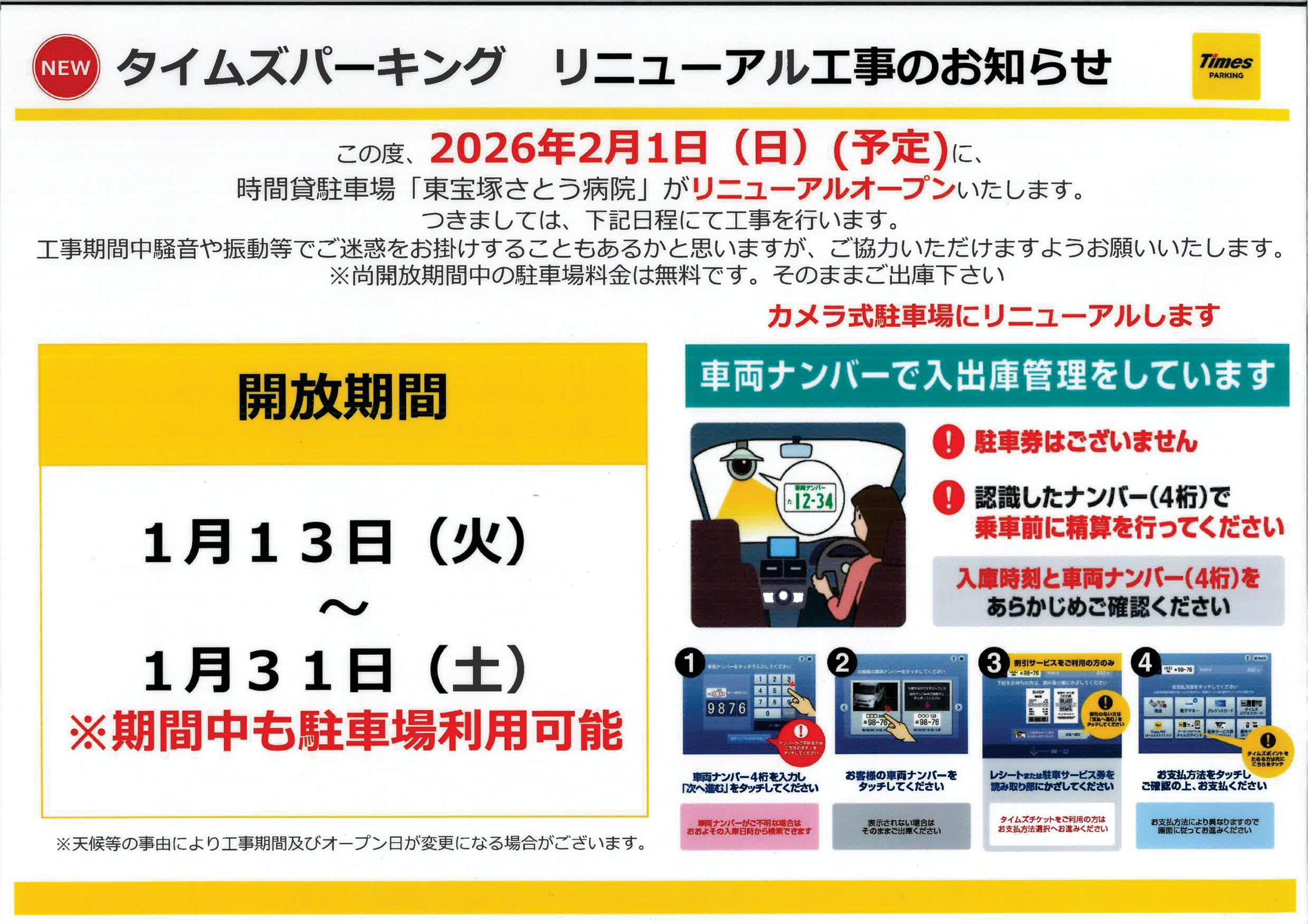 投稿日: 2025年12月10日2025年12月10日 投稿者: iryo-joho駐車場リニューアル工事のお知らせ 下記日程にて当院駐車場リニューアル工事を行います。 工事期間:2026年1月13日(火)~1月31日(土) 工事期間中も駐車場はご利用可能です。 工事中の騒音、振動などでご迷惑をお掛けすることもあるかと思いますが、ご理解ご協力のほどよろしくお願い致します。